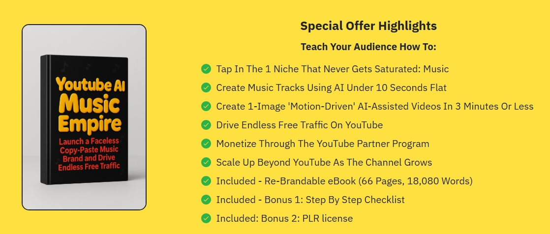 - A Complete 66-Page eBook Teaching The A-Z of AI Music Channel Creation – That’s PRICELESS