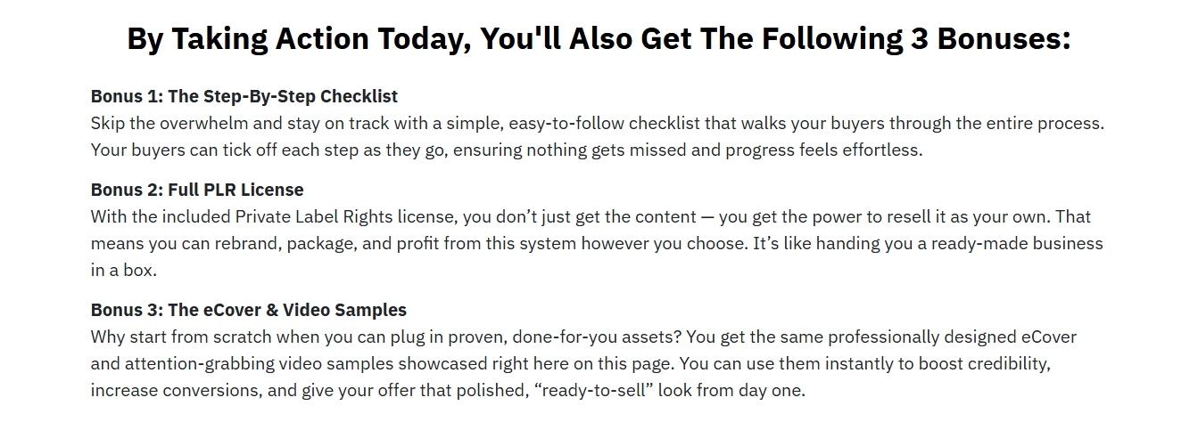 The package features include everything from the very eBook to high-value bonuses such as checklist (step-by-step) and real video samples! However, the best part is the Full PLR License that lets you take the whole thing and rebrand it and sell it as your product. Hence why it makes for the perfect move to enter the AI content wave and ride to the lead of a growing niche.