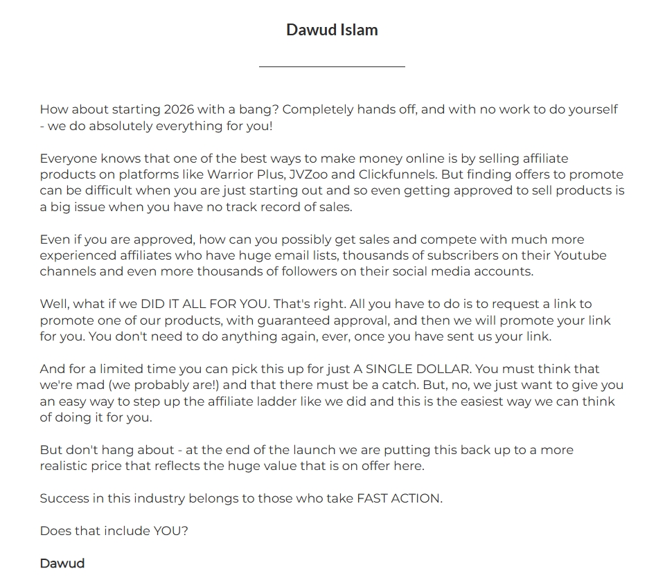 This system was created by Dawud Islam, a successful marketer who has built up substantial following on sites like WarriorPlus and JVZoo. This background makes him a good fit for a “done-for-you” model, since the success of this works depends on the person generating traffic and sales.