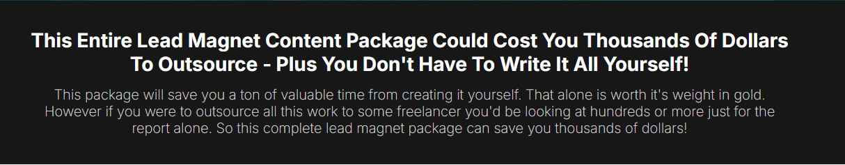 You’d easily spend over $500 for a custom lead magnet of this quality. The fact that you can get this entire package for less than a movie ticket is a steal. The cheapest time to start is now. This initial pricing was done to ensure easy entry point, value of the package increases with time.