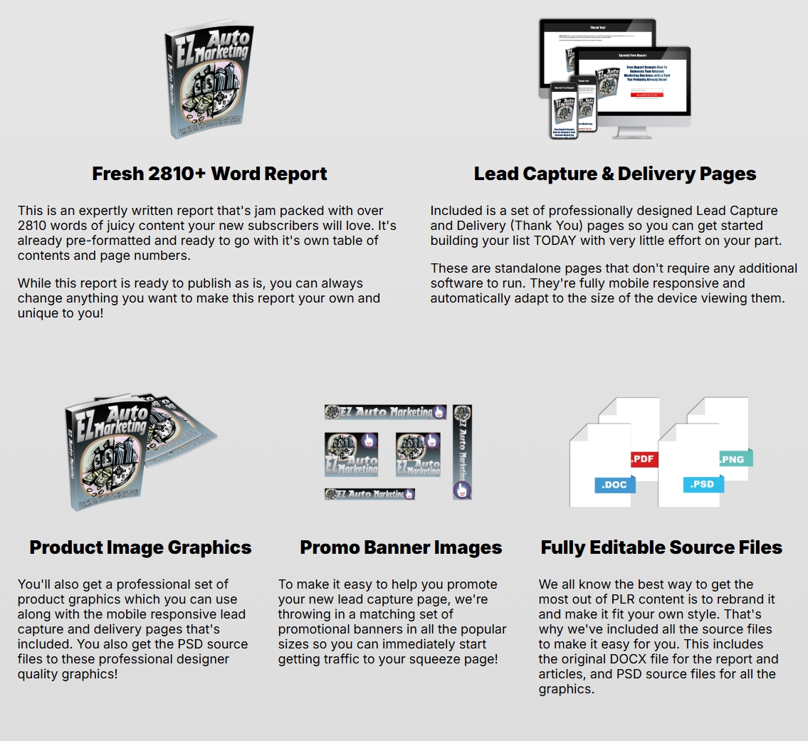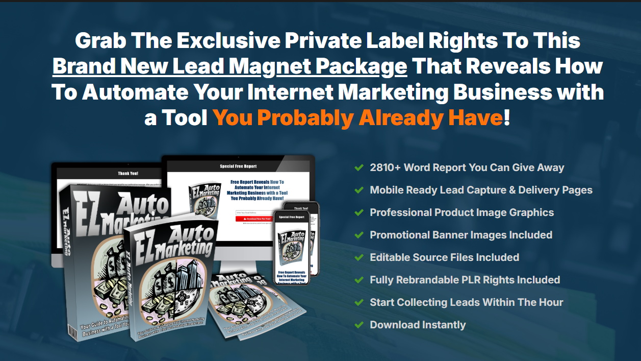 The (PLR) EZ Auto Marketing Lead Magnet Content Package is essentially a pre-built toolkit designed to help you capture email leads. The star of the show is a 2,810+ word report that teaches people how to automate their internet marketing using tools they probably already have. The idea is simple: you offer this valuable report for free, and in exchange, people give you their email address.