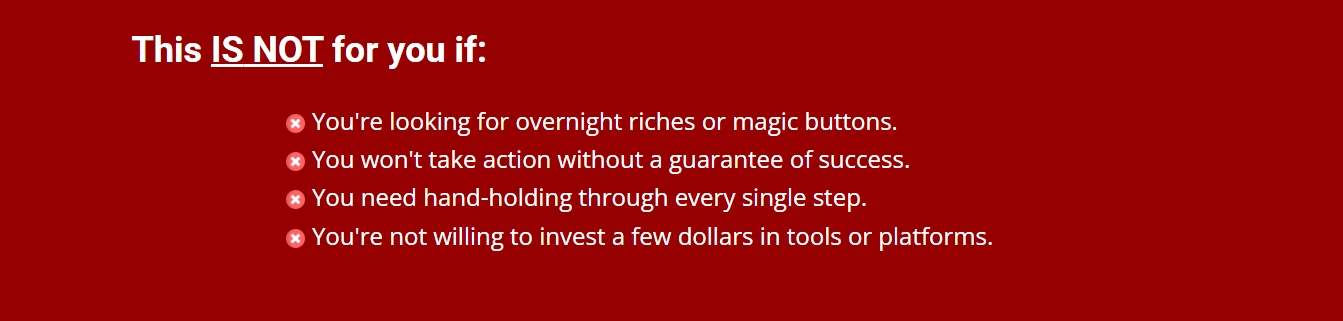 ❌ Expectation of instant riches: You will have to work for it, and the execution is vital with this one. This isn’t for someone who just wants to sit around and rake in the coin without putting forth an effort.